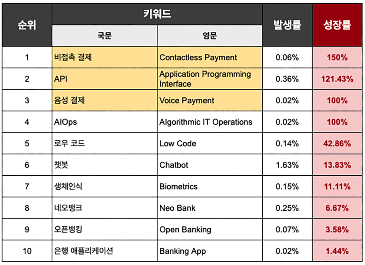 정보통신산업진흥원(nipa)이 발표한 '2024 핀테크 품목별 ICT 시장 동향' 유망 기술에 '비접촉 결제', 'API', '음성 결제' 등이 모두 상위권에 포진한 것을 볼 수 있음.