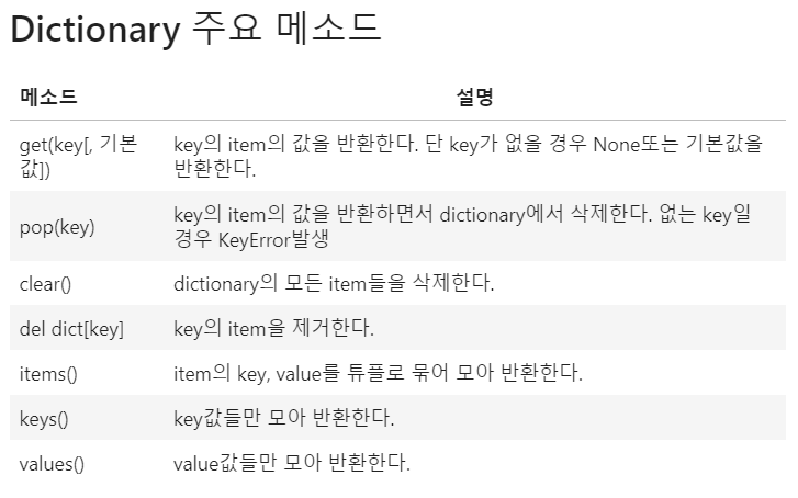 - 키(key)는 불변(Immutable)의 값들만 사용 가능하다. (숫자, 문자열, 튜플) 일반적으로 문자열을 사용한다.