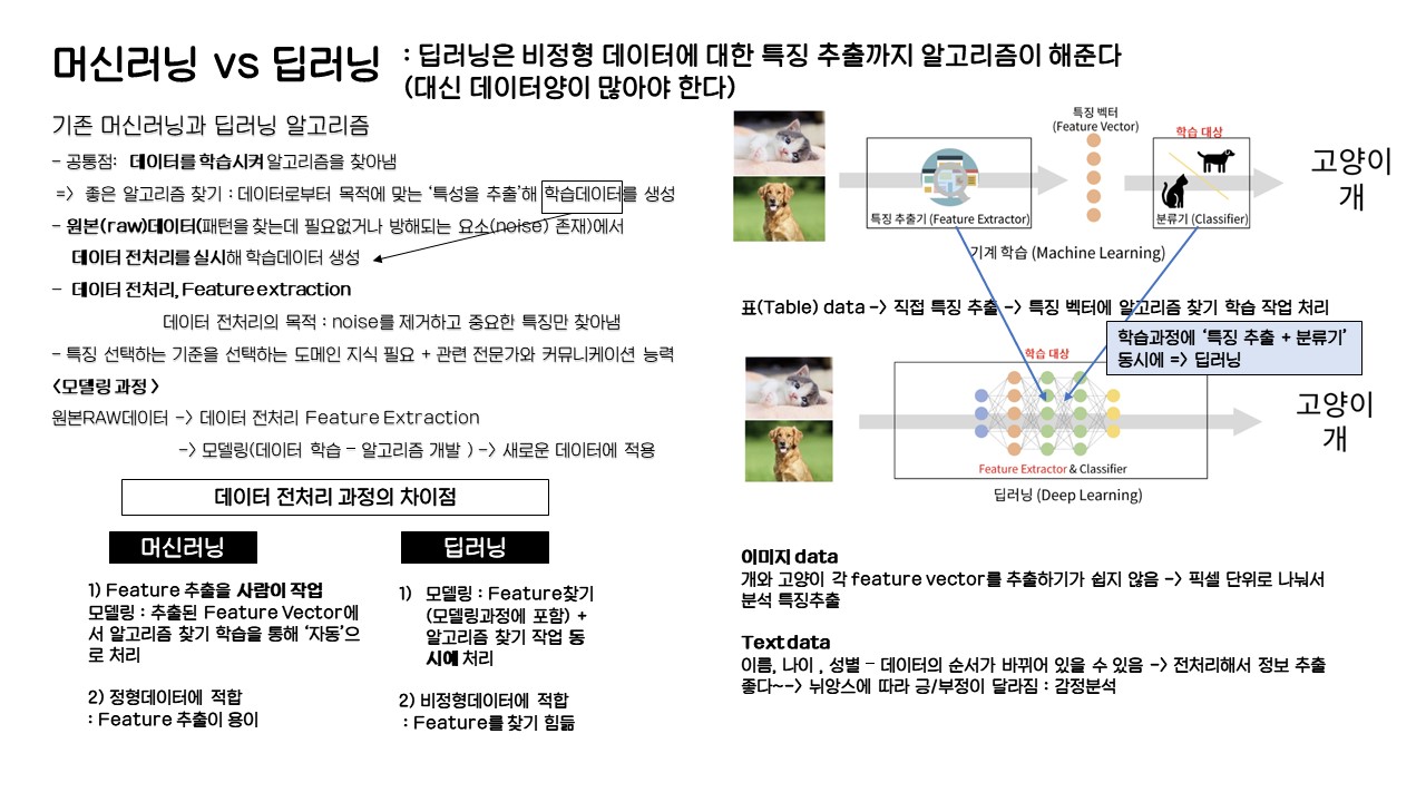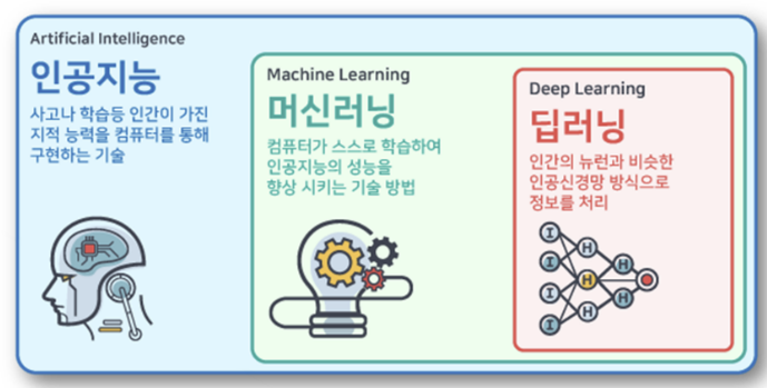 - 딥러닝은 인공신경망 알고리즘을 기반으로 하는 머신러닝의 분야 (머신러닝 > 딥 러닝)