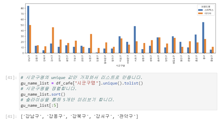 df_cafe라는 Dataframe에서 "시군구명" column을 기준으로 인덱싱하여 그 값을 리스트로 만드는 메소드를 적용한다고 읽을 수 있게 되었고,