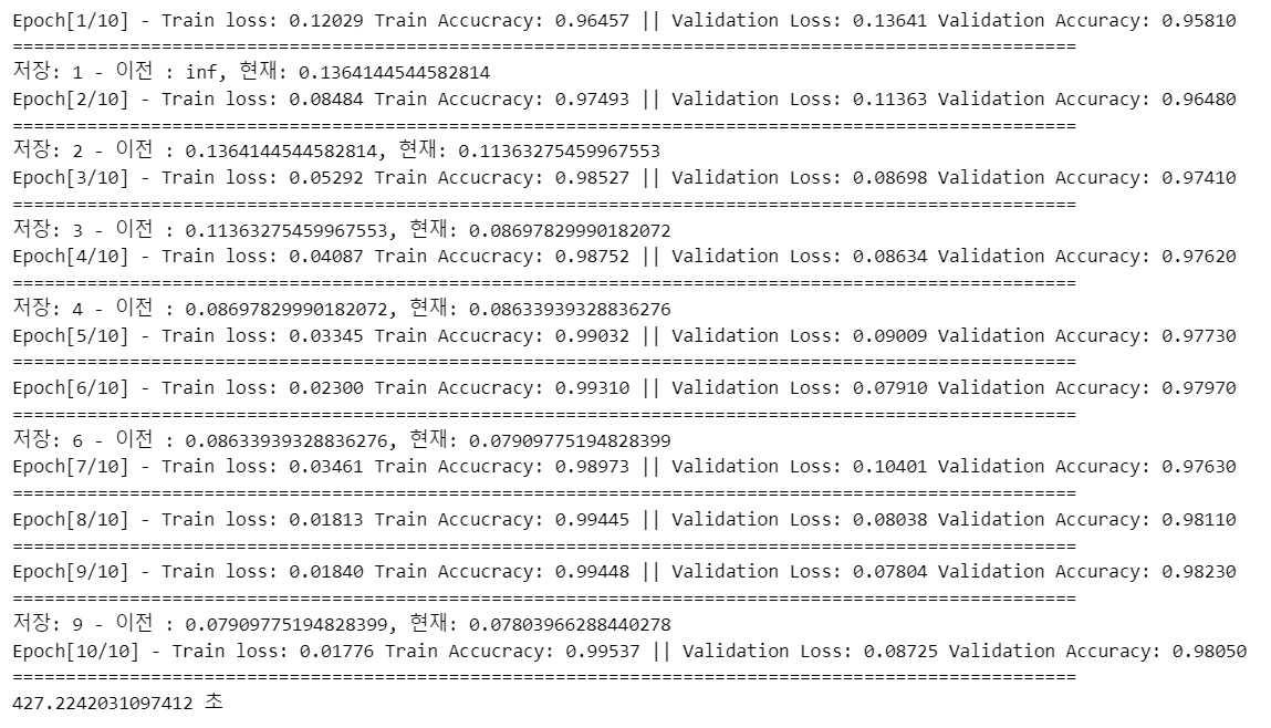 train.py 모듈(학습 모듈)에 저장했던 학습함수+검증함수인 fit함수에 dataloader와(train_loader, test_loader)모델( small_model), 손실함수와 최적화함수, 에폭수를 넣고, 추가적으로 모델 저장여부 +경로, device, mode를 정의하여 학습한다.