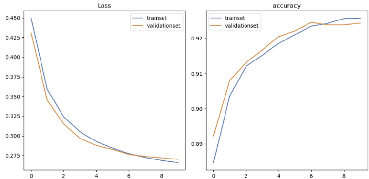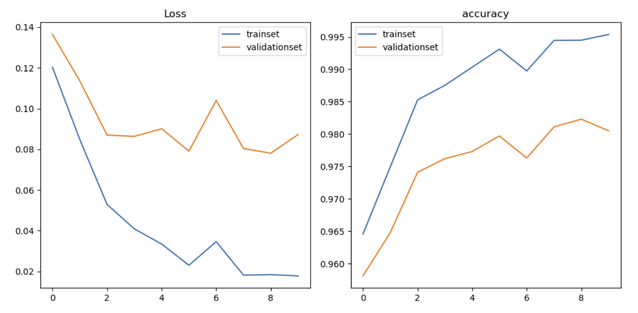 loss 그래프를 보면, traindata set은 loss가 점점 줄어들어 성능이 개선되는 반면 validation set은 성능이 초반부터 나쁠뿐더러 train set과의 차이를 보이고 있다. 이는 과대적합 문제가 발생했다는 것이므로,