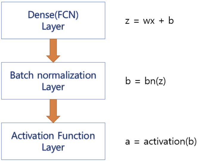 - Linear함수의 출력값에 BatchNorm을 통해 정규화를 진행한 후 Activation함수에 전달