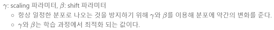 감마(scale)와 베타(shift) 값은 학습과정에서 최적화 되는 값이다. 즉, Backpropagation을 통해서 학습이 된다.