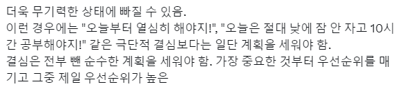 ex. 수업듣고 → 그날 블로그 정리, 모델링 수업 → 실제 모델링 경진대회 참여 , 프로젝트 아이데이션 → 일단 현재 상태에서 최선인 상황으로 정리 - 제 3자의 입장에서 계획을 고안할 것, 감정에 치우치치 않고 그 계획을 실행할 것