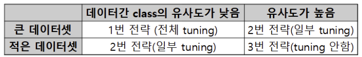 - Train dataset의 양이 적고 Pretrained 모델이 학습했던 dataset과 Custom dataset의 class간의 유사성이 높은 경우 적용.