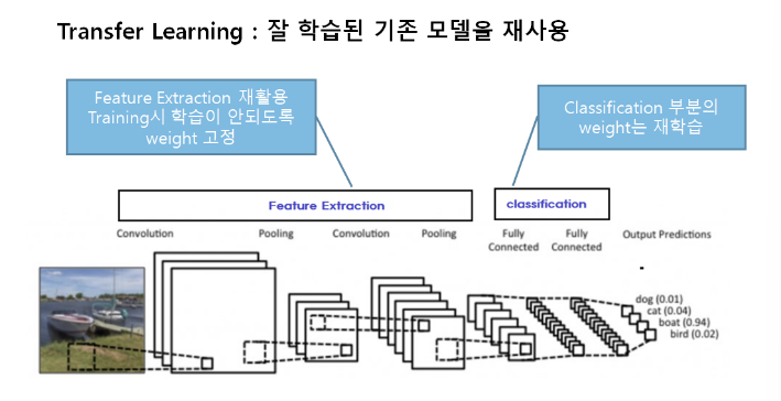 Transfer Learning : pre-trained model에서 feature extracxtor를 가져와 일반적인 특징을 추출하고 직접 구성한 new classfier에서 학습을 진행해 업데이트한다.