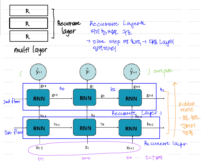 - 여러층을 쌓은 경우 먼저 쌓은 layer의 모든 time step별 출력이 다음 Layer의 입력 데이터로 사용된다.