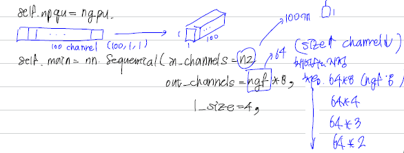 ngf: 제너레이터의 레이어들을 통과한 특징 맵크기의 기본값으로 레이어 별로 이 값에 * N한 값을 out features로 설정.