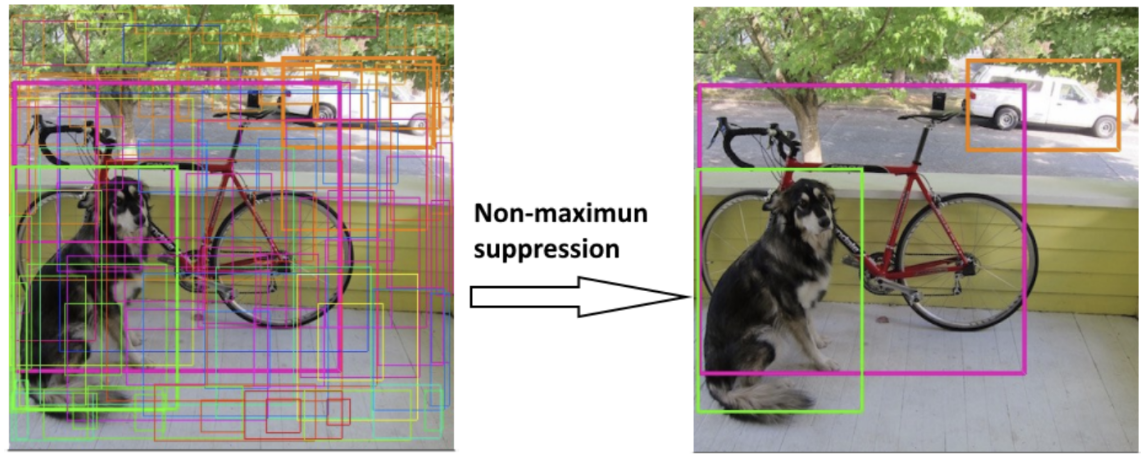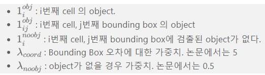 - (x,y)는 중심점의 좌표, (w,h)는 bounding box의 너비의 높이, c는 해당 bounding box에 대한 신뢰점수(Confidence)