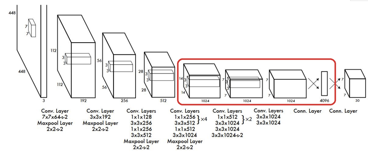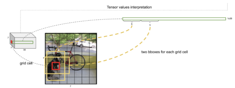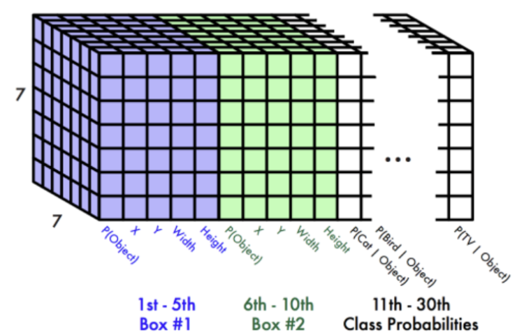 => (7, 7, 30) shape은 7x7 grid cell에 대해 box 1(c,x,y,w,h) 5개 + box 2(c,x,y,w,h) 5개 + 파스칼 classes 20개 = 30개로 나열된형대이다.(박스가 2개인 경우)