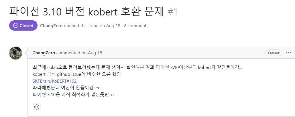 파이썬 3.10이상부터 colab에서 kobert가 실행이 안되는 문제가 다른 사람들에게도 공통적으로 발생하고 있었다.