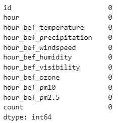 train 데이터를 확인하니, 전체 1459행을 가지는 데이터에서 ,hour_bef_temperature, hour_bef_precipitation, hour_bef_windspeed, hour_bef_humidity, hour_bef_visibility, hour_bef_ozone, hour_bef_pm10, hour_bef_pm2.5(index 2~9) 총 8개 column에서 결측치가 발견되었다.