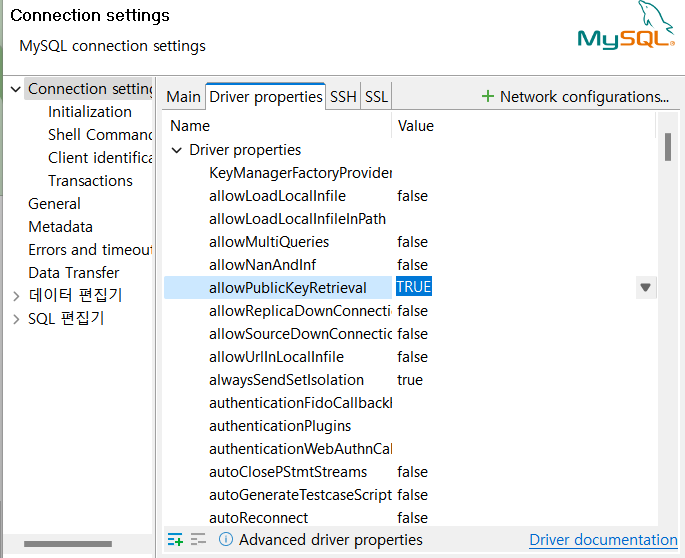 Connection settings창에서 Driver properties 클릭 > allowPublicKeyRetreval 을 True로 바꿔준다 > 확인 버튼