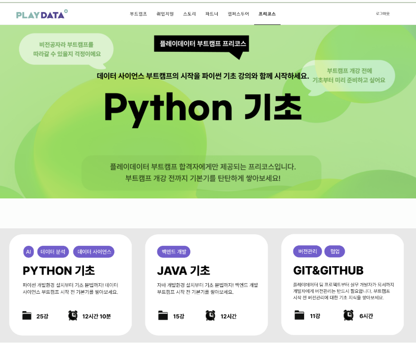 플레이데이터에서는 부트캠프에 합격하면 기초 지식이 없는 사람들을 위해 ,프리코스라는 이름의 기초 인강을 제공한다.
